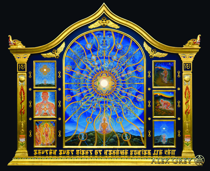 I spent the next year painting each scene and sculpted an unusual frame to hold the paintings. As I was working on the painting, a poem related to each panel came through me. The finished altarpiece, Nature of Mind, is my homage to the artists and wisdom masters of Tibet. The Tibetan Buddhist teachings known as Dzogchen were the inspiration for these visions.