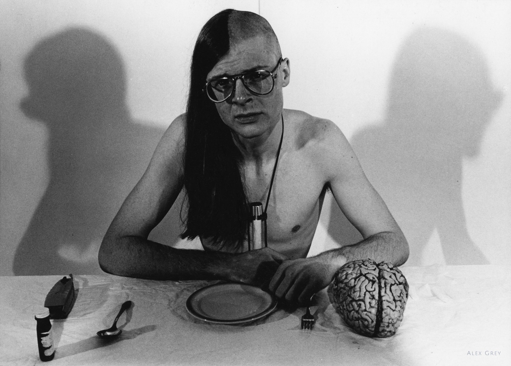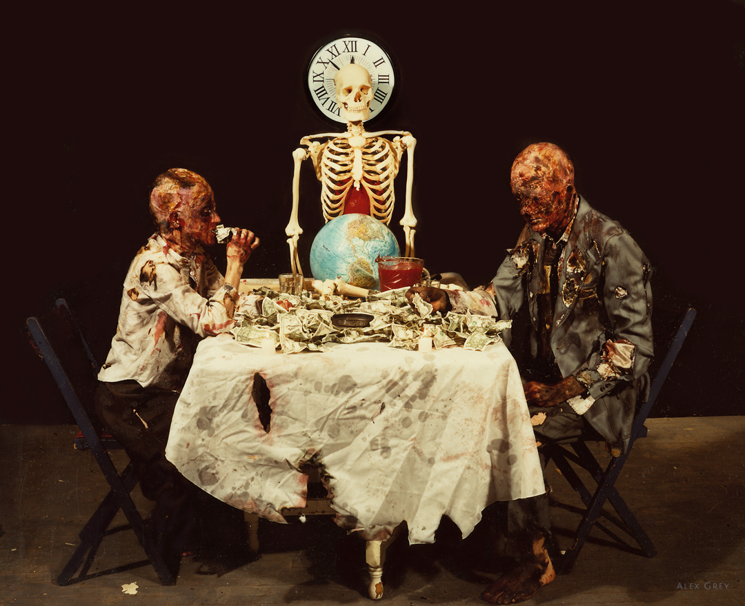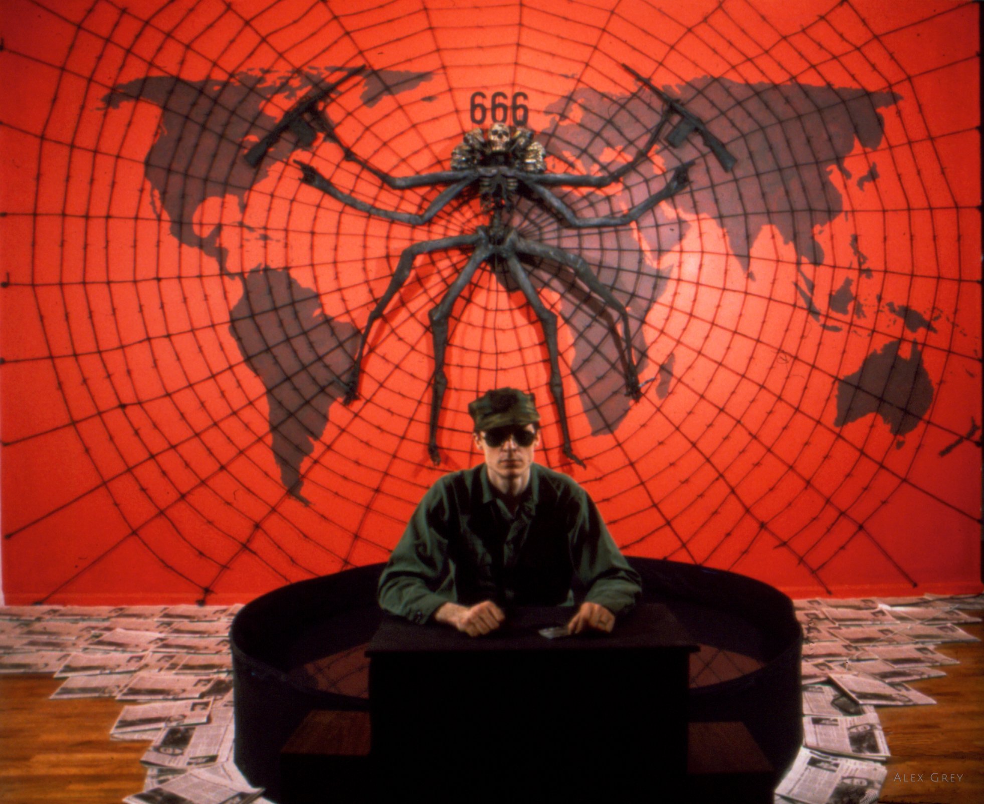 The first was a photo mural of my face, behind which was a praying skeleton with a propane torch coming out of its third eye. I lit the torch and it burned through the third eye of the photo mural.