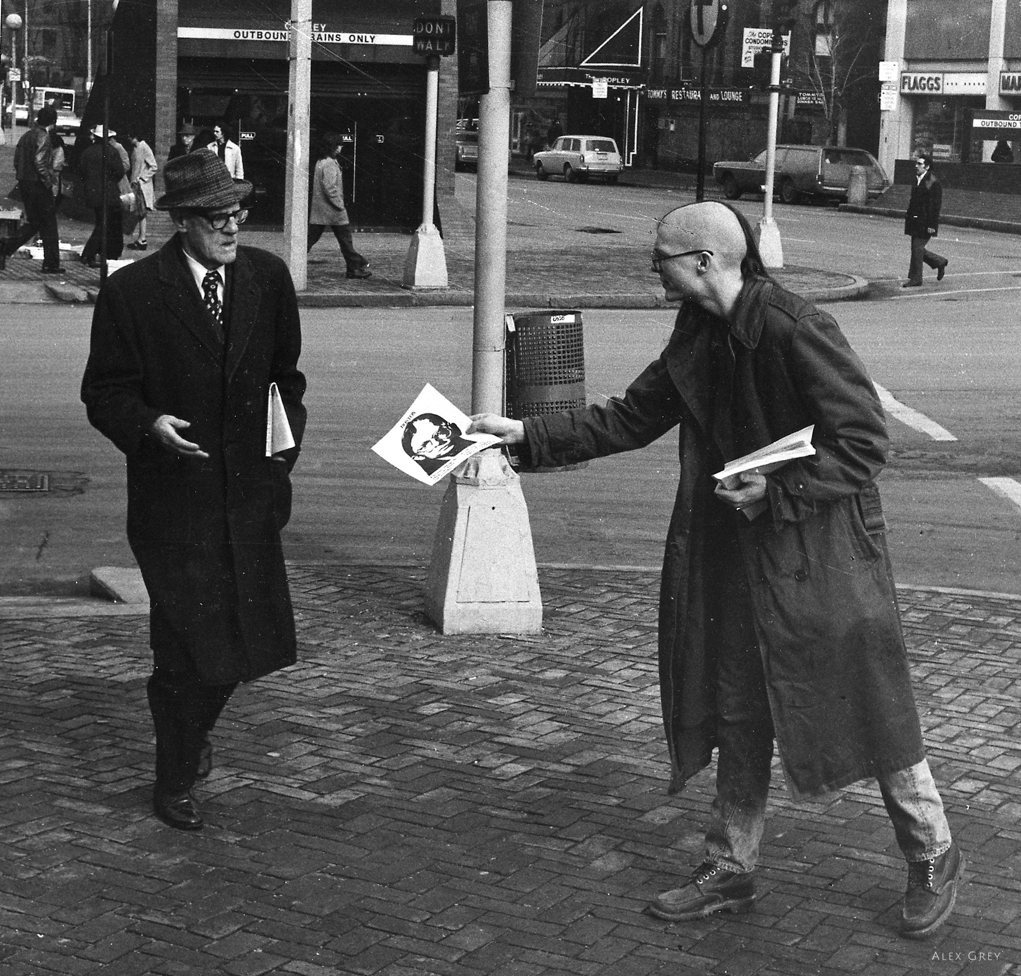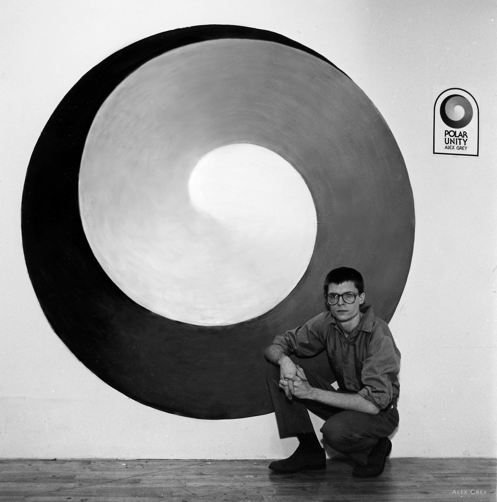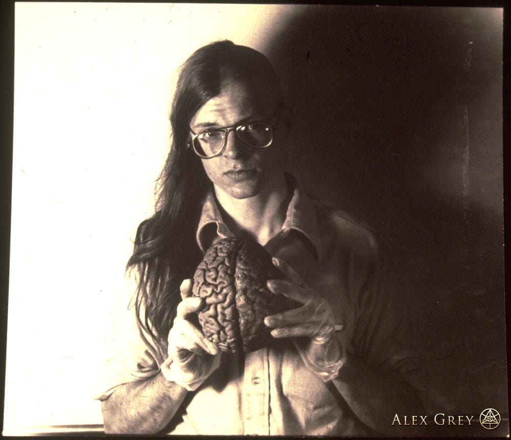 The first was a photo mural of my face, behind which was a praying skeleton with a propane torch coming out of its third eye. I lit the torch and it burned through the third eye of the photo mural.
