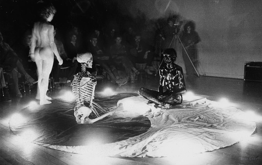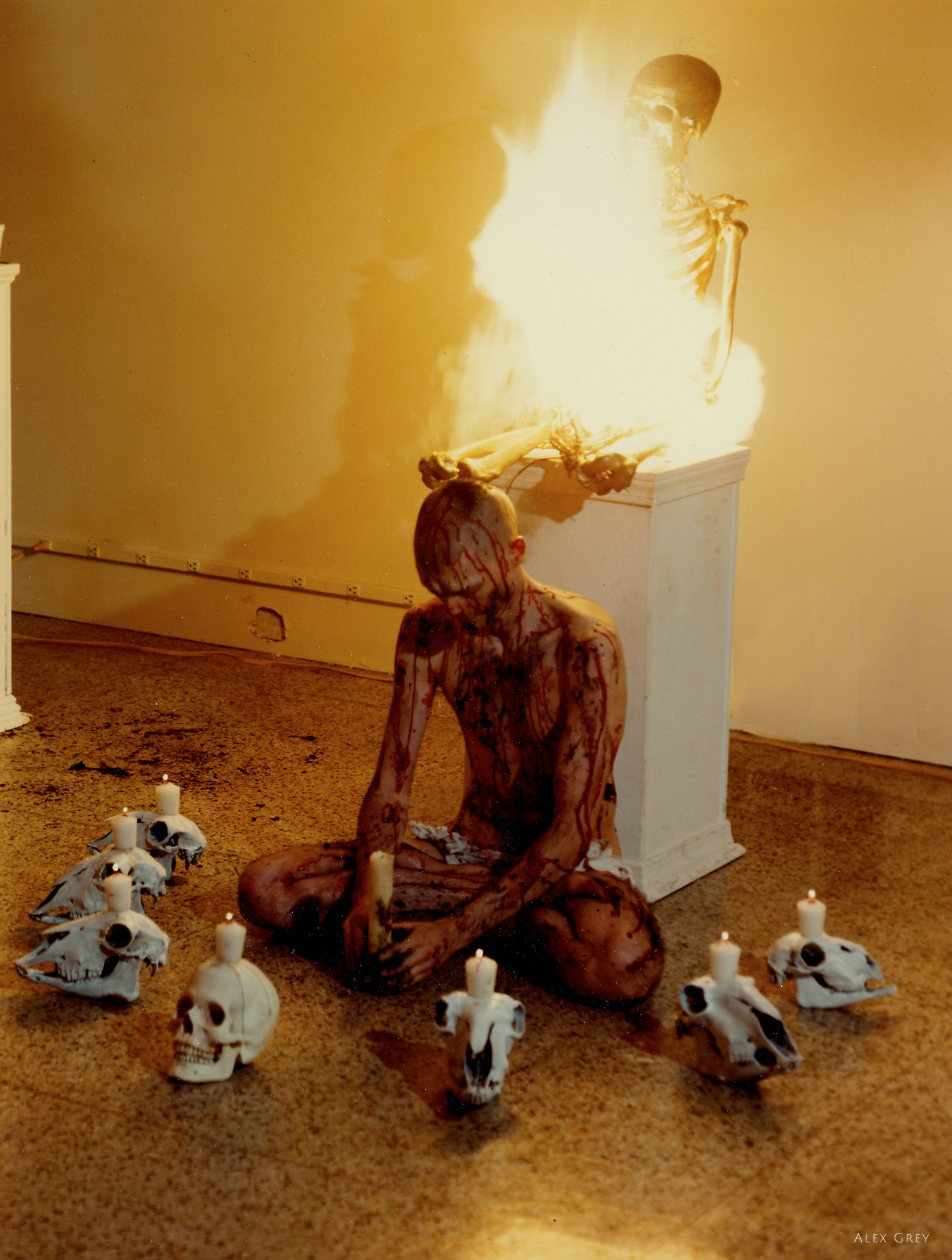 For the third sculpture, I sat on the floor and lit candles over the heads of seven skulls before me. A skeleton above me burst into flames and firecrackers went off in its skull.