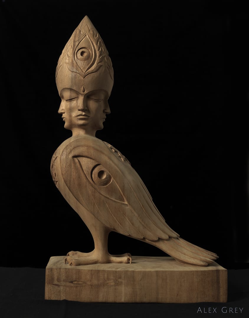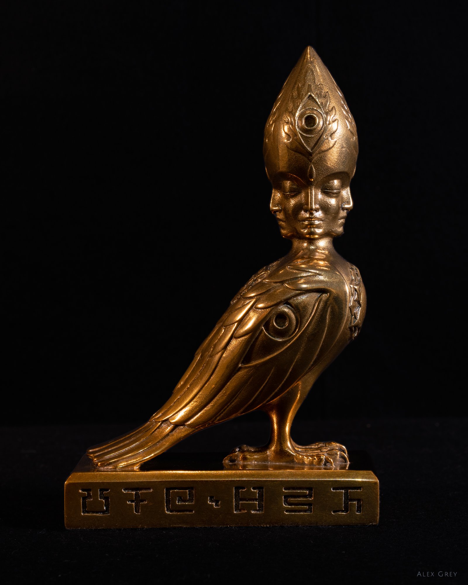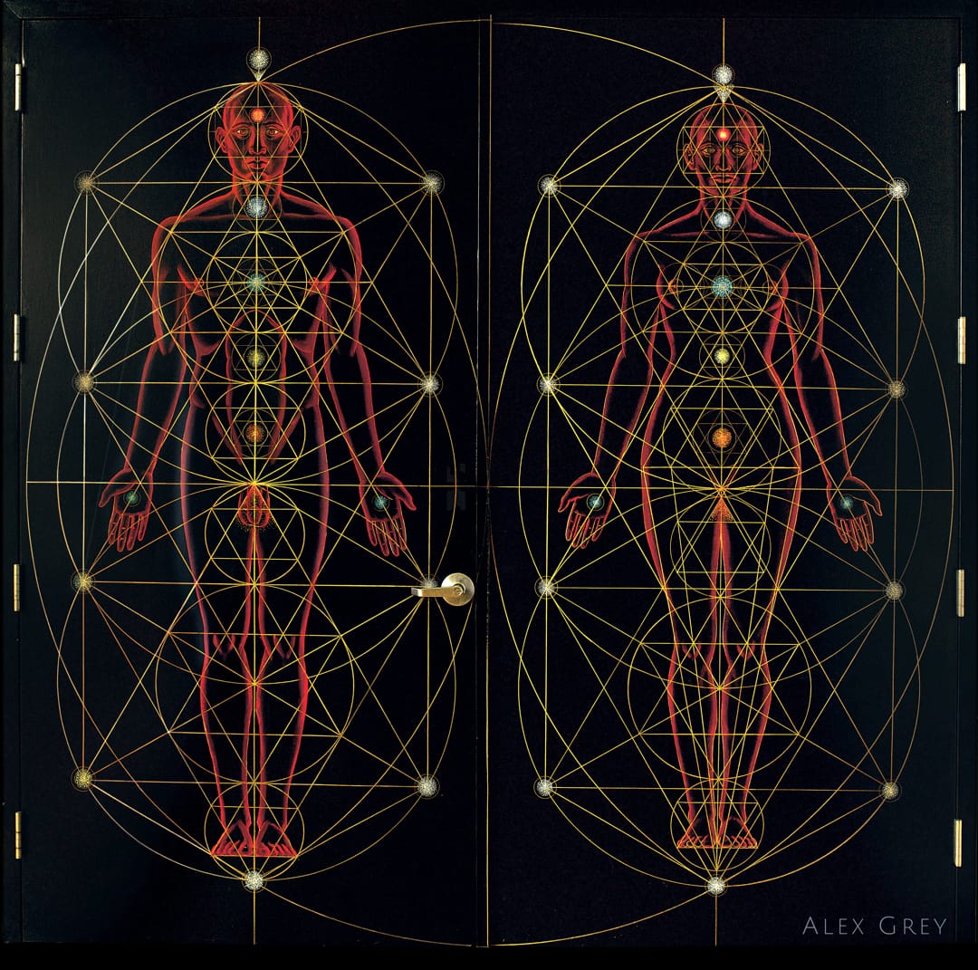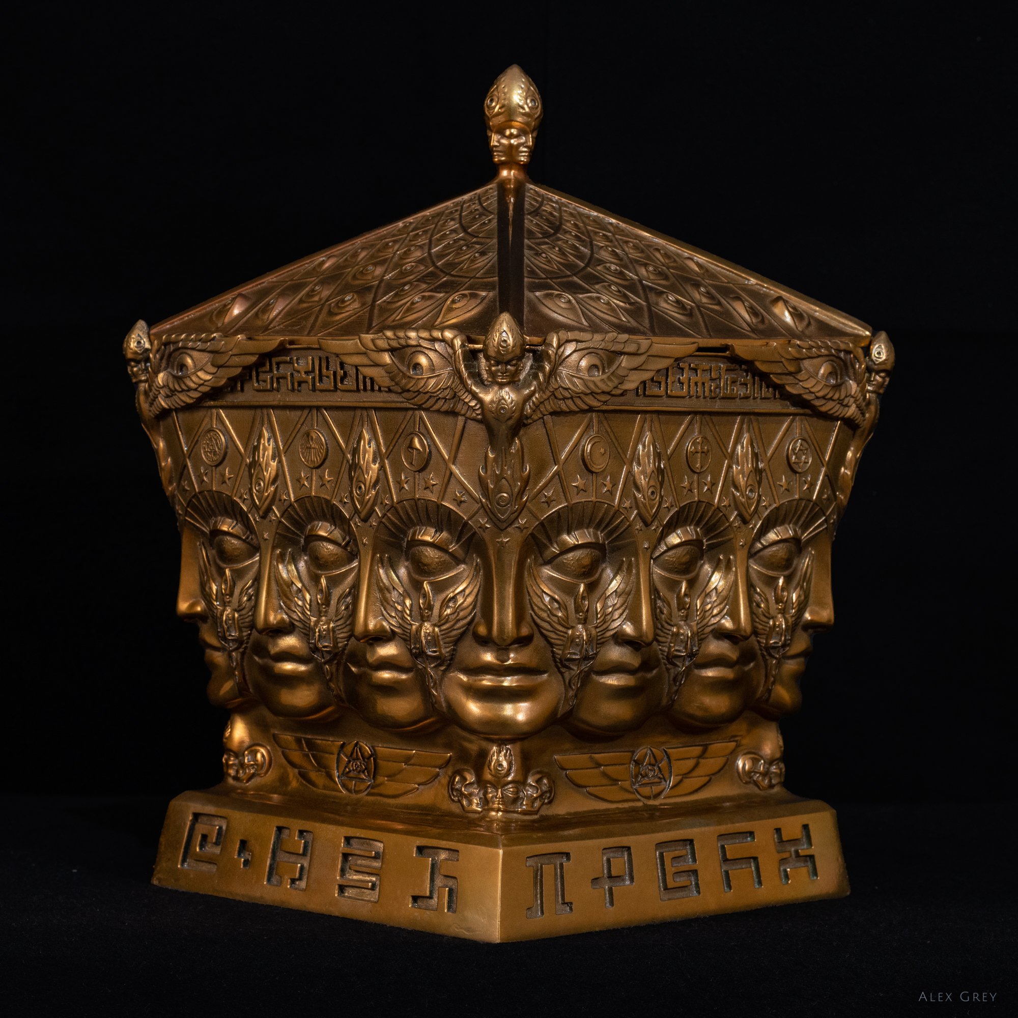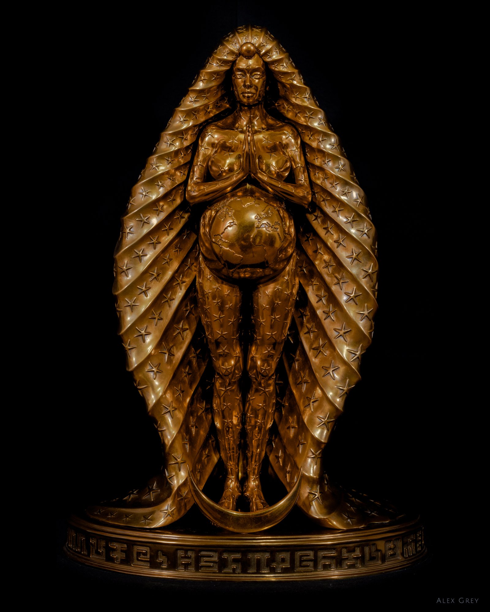 Surrounding each image is a 5 x 10.5 foot arched frame specifically designed for the Sacred Mirrors. The frames feature a sculptural relief of the history of the universe, from big bang cosmogenesis through biological and technological evolution, providing a philosophical framework in which to view the Sacred Mirrors.