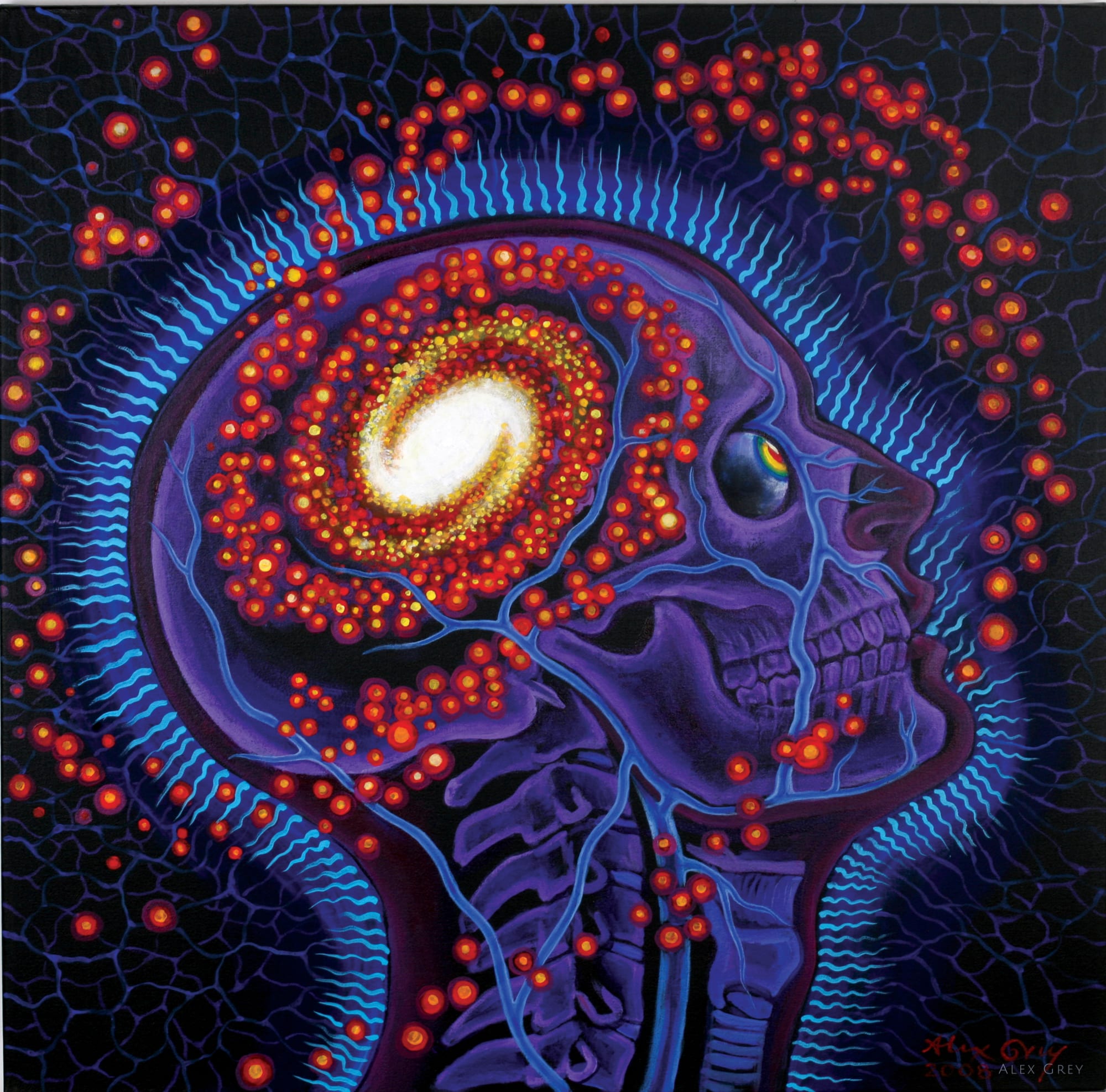 During deep meditation, I entered a state where all energy systems in my body were completely aligned and flowing. It was in this state that I envisioned Theologue. I was wearing a Mindfold which allowed me to stare into total darkness. I stared into an infinite regress of electric perspective grids that radiated from my brain/mind and led to the horizon. A mystic fire engulfed me. Across the horizon all I could see were perspective lines going into deep space. I was seeing both the perceptual grid of my mind on which space and time are woven, and the universal mind which was both the source and the weaving loom. At this moment, faintly, Himalayan mountains appeared. Transparent, but present, they formed a vast and beautiful panorama and then disappeared back into the grid.